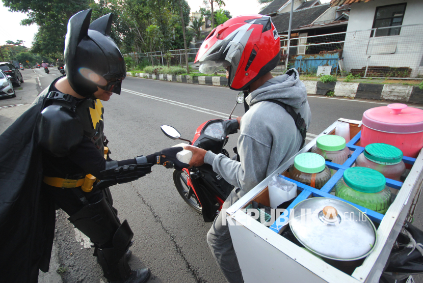 Para cosplayer super hero dari komunitas Badut Cimahi membagikan takjil kepada warga di jalan Aruman, Cimahi Utara, Kota Cimahi, Selasa (3/3/2026). Kegiatan berbagi takjil ini sebagai bentuk empati untuk masyarakat yang sedang berpuasa Ramadhan sekaligus kampanye perdamaian, agar selalu jaga emosi karena perdamaian itu indah. (FOTO : Edi Yusuf)