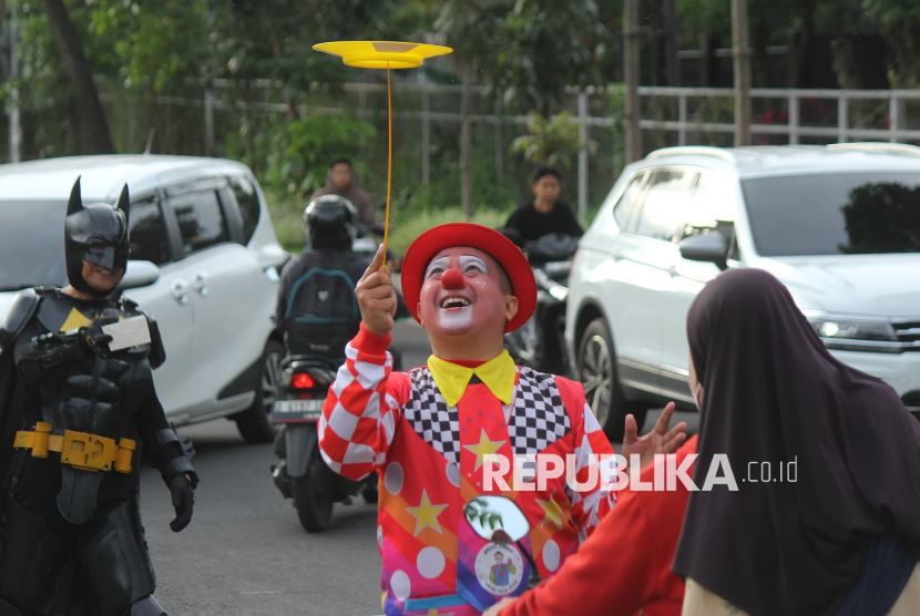 Badut bersama para cosplayer super hero dari komunitas Badut Cimahi menghibur masyarakat saat kegiatan membagikan takjil di jalan Aruman, Cimahi Utara, Kota Cimahi, Selasa (3/3/2026). Kegiatan berbagi takjil ini sebagai bentuk empati untuk masyarakat yang sedang berpuasa Ramadhan sekaligus kampanye perdamaian, agar selalu jaga emosi karena perdamaian itu indah. (FOTO : Edi Yusuf)