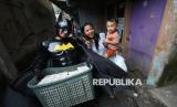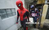 Para cosplayer super hero dari komunitas Badut Cimahi membawa takjil untuk dibagikan kepada warga di Cimahi Utara, Kota Cimahi, Selasa (3/3/2026). Kegiatan berbagi takjil ini sebagai bentuk empati untuk masyarakat yang sedang berpuasa Ramadhan sekaligus kampanye perdamaian, agar selalu jaga emosi karena perdamaian itu indah. (FOTO : Edi Yusuf)