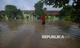 Seorang relawan desa berada di halaman sekolah yang terendam banjir di Sekolah Dasar Negeri 2 Plosowangi, Cawas, Klaten, Jawa Tengah, Rabu (4/3/2026). Curah hujan tinggi pada Selasa (3/3) menyebabkan Sungai Dengkeng meluap sehingga sekolahan tersebut terendam banjir dan proses ujian tengah semester tertunda. (FOTO : ANTARA FOTO/Aloysius Jarot Nugroho)
