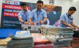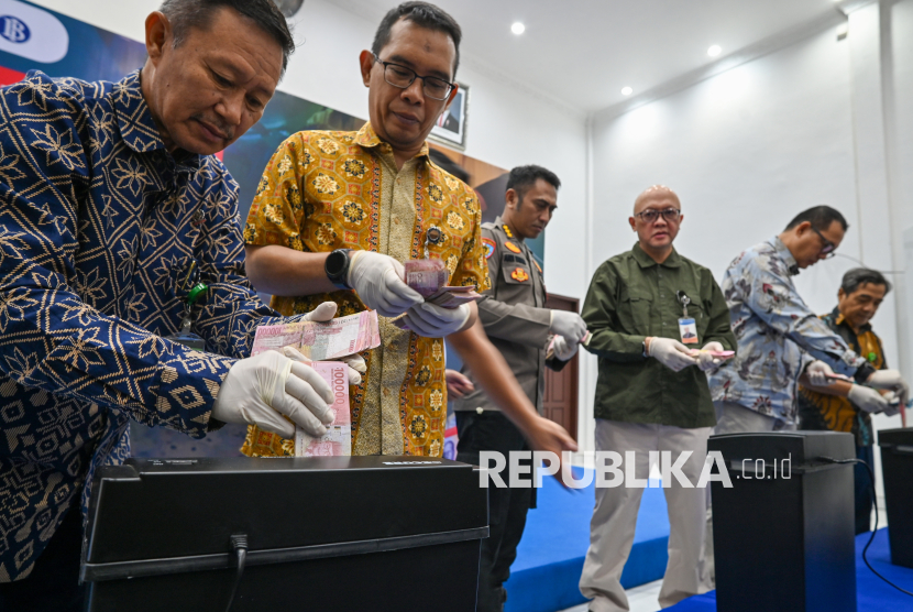 REPUBLIKA.CO.ID, PALU -- Sejumlah petugas memasukkan uang rupiah tidak asli ke dalam mesin pencacah pada pemusnahan fisik uang rupiah tidak asli di Palu, Sulawesi Tengah, Kamis (5/3/2026).