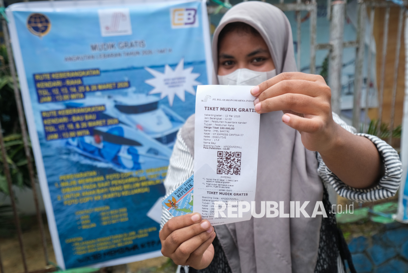 Seorang warga menunjukkan tiket mudik gratis miliknya di Pelabuhan Nusantara Kendari, Kota Kendari, Sulawesi Tenggara, Sabtu (7/3/2026). Kementerian Perhubungan (Kemenhub) melalui Direktorat Jendral Perhubungan Laut (Hubla) menyiapkan 6.770 tiket kapal laut gratis untuk arus mudik dan balik Idul Fitri 1447 H dengan rute Kendari-Raha-Baubau di Provinsi Sulawesi Tenggara. (FOTO : ANTARA FOTO/Andry Denisah)