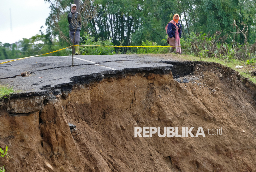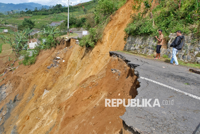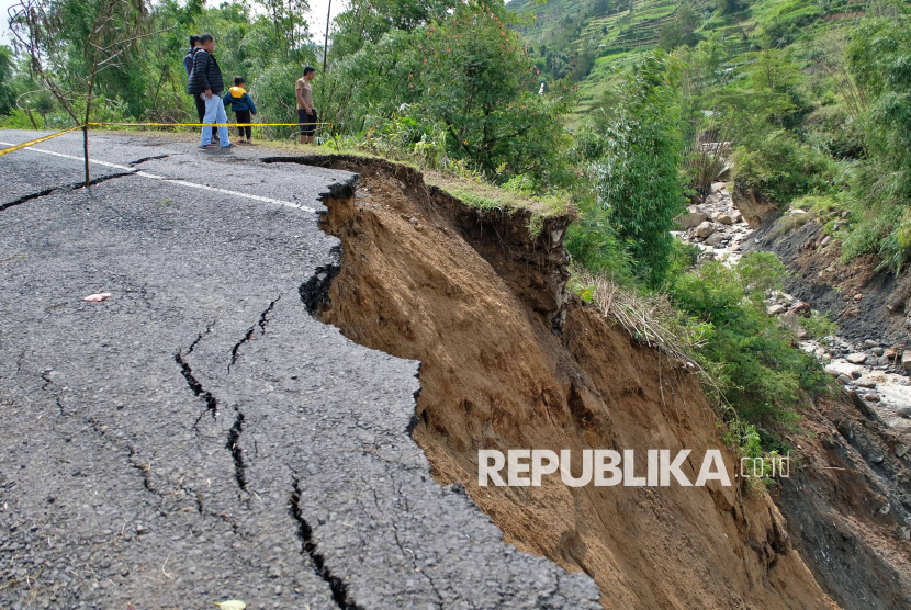 REPUBLIKA.CO.ID, BANJARNEGARA -- Warga menyaksikan jalan longsor di kawasan dataran tinggi Dieng Desa Ratamba, Pejawaran, Banjarnegara, Jawa Tengah, Ahad (8/3/2026).