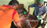 Pengurus masjid membuat hidangan bubur india di Masjid Djami Pekojan, Kota Semarang, Jawa Tengah, Jumat (6/3/2026). Tradisi membagikan bubur India secara gratis untuk hidangan berbuka puasa telah menjadi ciri khas Masjid Djami Pekojan selama bertahun-tahun. Bubur kental berwarna putih gading ini memiliki rasa yang khas, dengan campuran rempah-rempah dan sayuran yang lezat. (FOTO : Republika/Kamran Dikarma)