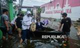 Warga turun dari perahu untuk menuju tempat pengungsian di Perumahan Periuk Damai, Kota Tangerang, Banten, Selasa (10/3/2026). Badan Penanggulangan Bencana Daerah (BPBD) Kota Tangerang mencatat hingga Selasa (10/3) pukul 12.00 WIB, sebanyak 13.410 jiwa terdampak banjir dan 5.786 warga terpaksa mengungsi ke sejumlah tempat pengungsian di wilayah Kecamatan Periuk akibat banjir yang melanda permukiman hingga mencapai ketinggian empat meter. (FOTO : ANTARA FOTO/Putra M. Akbar)