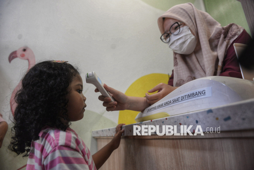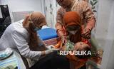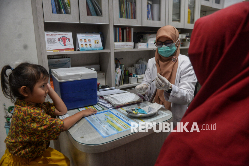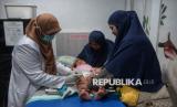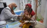 Petugas kesehatan memeriksa seorang anak sebelum disuntik vaksin campak di Rumah Vaksinasi Pusat, Jakarta, Kamis (12/3/2026). Ikatan Dokter Anak Indonesia (IDAI) bekerja sama dengan Rumah Vaksinasi Pusat menyelenggarakan vaksinasi massal campak gratis bagi anak usia 9 hingga 59 bulan sebagai wujud kepedulian terhadap kesehatan anak Indonesia. Dalam beberapa waktu terakhir, kasus campak pada anak menunjukkan peningkatan yang perlu menjadi perhatian bersama, terlebih menjelang libur panjang Hari Raya Idulfitri yang biasanya diiringi dengan tingginya mobilitas masyarakat. Menyikapi hal tersebut, Pengurus Pusat Ikatan Dokter Anak Indonesia (IDAI) mengimbau para orang tua untuk segera melengkapi imunisasi campak (MR) pada anak yang masih sehat sebagai langkah perlindungan optimal. (FOTO : Republika/Prayogi)