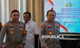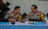 Kapolda Metro Jaya Irjen Pol Asep Edi Suheri (kanan) berbincang dengan Kabid Humas Polda Metro Jaya Kombes Pol Budi Hermanto (kiri) saat menyampaikan keterangan pers terkait perkembangan penanganan kasus penyiraman cairan berbahaya di Polda Metro Jaya, Jakarta, Senin (16/3/2026). Dalam keterangan pers, Polda Metro Jaya menyampaikan fakta hasil penyelidikan berdasarkan analisis dari 86 titik kamera CCTV yakni terduga pelaku terindikasi sebanyak 4 orang dengan 2 sepeda motor, mengumpulkan barang bukti di TKP, keterangan sejumlah saksi serta mengklarifikasi foto terduga wajah pelaku yang viral di media sosial merupakan hasil rekayasa AI. Selain itu, Polri telah membentuk tim gabungan pengungkapan perkara kasus penyiraman cairan berbahaya terhadap aktivis KontraS, Andrie Yunus. (FOTO : Republika/Thoudy Badai)