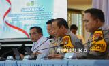 Kapolda Metro Jaya Irjen Pol Asep Edi Suheri (tengah), Wakapolda Metro Jaya Brigjen Pol Dekananto Eko Purwono (kanan) dan , Kabid Humas Polda Metro Jaya Kombes Pol Budi Hermanto (kiri) saat menyampaikan kterangan pers terkait perkembangan penanganan kasus penyiraman cairan berbahaya di Polda Metro Jaya, Jakarta, Senin (16/3/2026). Dalam keterangan pers, Polda Metro Jaya menyampaikan fakta hasil penyelidikan berdasarkan analisis dari 86 titik kamera CCTV yakni terduga pelaku terindikasi sebanyak 4 orang dengan 2 sepeda motor, mengumpulkan barang bukti di TKP, keterangan sejumlah saksi serta mengklarifikasi foto terduga wajah pelaku yang viral di media sosial merupakan hasil rekayasa AI. Selain itu, Polri telah membentuk tim gabungan pengungkapan perkara kasus penyiraman cairan berbahaya terhadap aktivis KontraS, Andrie Yunus. (FOTO : Republika/Thoudy Badai)