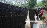 Pekerja menjemur batik di pabrik batik Rifqy di Trusmi, Kabupaten Cirebon, Selasa (10/3/2026). Menurut pemilik pabrik batik binaan Bank BJB ini, Ernawati mengungkapkan jelang Lebaran omset batik mengalami peningkatan hingga 50 persen. Selain pakaian, masyarakat juga banyak memesan jenis sarung batik khas Cirebon. (FOTO : Edi Yusuf)