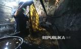Pekerja membilas batik di pabrik batik Rifqy di Trusmi, Kabupaten Cirebon, Selasa (10/3/2026). Menurut pemilik pabrik batik binaan Bank BJB ini, Ernawati mengungkapkan jelang Lebaran omset batik mengalami peningkatan hingga 50 persen. Selain pakaian, masyarakat juga banyak memesan jenis sarung batik khas Cirebon. (FOTO : Edi Yusuf)