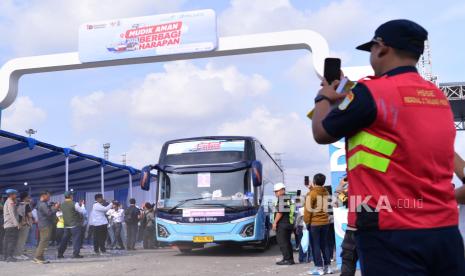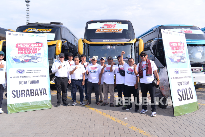 Bus yang mengangkut pemudik pada program Mudik Gratis Pelindo Group diberangkatkan dari Buffer Area Pelabuhan Tanjung Priok, Jakarta Utara, Selasa (17/3/2026). PT Jakarta International Container Terminal (JICT) mendukung program Mudik Gratis Pelindo Group dengan menyediakan lima unit bus untuk mengantarkan ratusan pemudik menuju Surabaya, Solo, dan Madiun. (FOTO : Dok Republika)