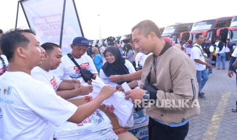 Pemudik mengikuti program Mudik Gratis Pelindo Group di Buffer Area Pelabuhan Tanjung Priok, Jakarta Utara, Selasa (17/3/2026). PT Jakarta International Container Terminal (JICT) mendukung program Mudik Gratis Pelindo Group dengan menyediakan lima unit bus untuk mengantarkan ratusan pemudik menuju Surabaya, Solo, dan Madiun. (FOTO : Dok Republika)