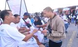 Direktur Utama JICT Ade Hartono berbincang dengan pemudik sebelum diberangkatkan ke daerah tujuan Surabaya, Solo, dan Madiun dalam program Mudik Gratis Pelindo Group di Buffer Area Pelabuhan Tanjung Priok, Jakarta Utara, Senin pagi (17/3/2026). PT Jakarta International Container Terminal (JICT) mendukung program Mudik Gratis Pelindo Group dengan menyediakan lima unit bus untuk mengantarkan ratusan pemudik menuju Surabaya, Solo, dan Madiun. (FOTO : Dok Republika)