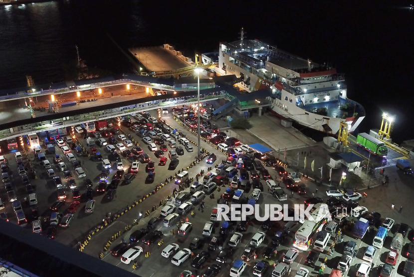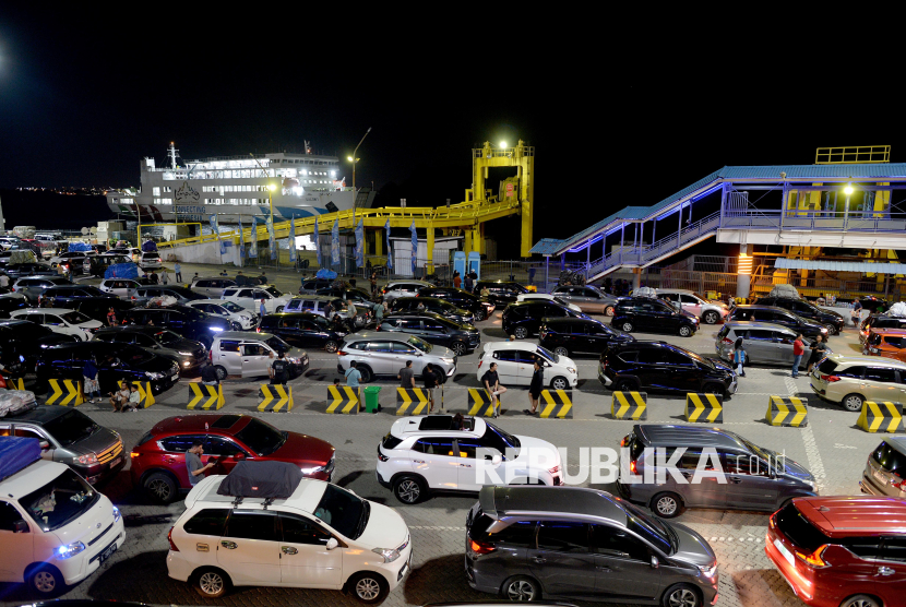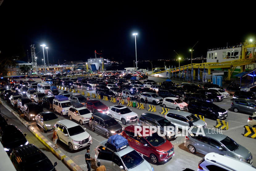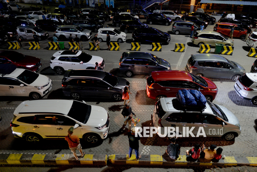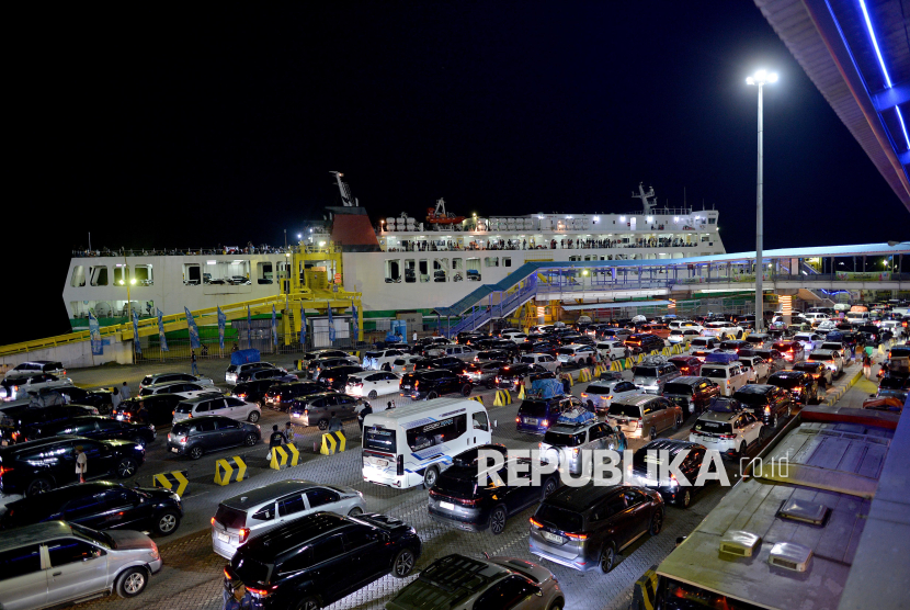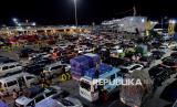 Kendaraan antre untuk memasuki kapal penyeberangan di Pelabuhan Merak, Banten, Rabu (18/3/2026). Puncak arus mudik Idul Fitri 2026 di Pelabuhan Merak terjadi pada Rabu (18/3) dinihari. Ribuan kendaraan antre untuk menyeberang menuju Pelabuhan Bakauheni Lampung. (FOTO : Edwin Putranto/Republika)