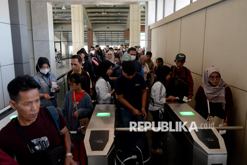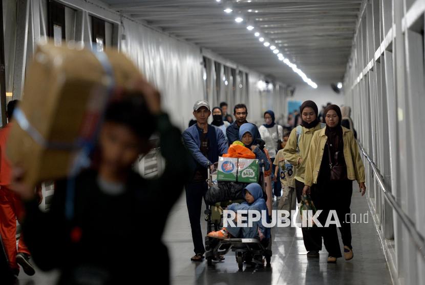 Penumpang berjalan untuk memasuki kapal penyeberangan di Pelabuhan Merak, Banten, Rabu (18/3/2026). Puncak arus mudik Idul Fitri 2026 di Pelabuhan Merak terjadi pada Rabu (18/3) dinihari. Ribuan kendaraan antre untuk menyeberang menuju Pelabuhan Bakauheni Lampung. (FOTO : Edwin Putranto/Republika)