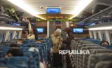 Penumpang kereta cepat Whoosh mencari tempat duduk didalam gerbong di Stasiun KCIC Halim, Jakarta, Rabu (18/3/2026). Sejak dibukanya Posko Angkutan Lebaran hingga hari ini, penjualan tiket Whoosh telah mencapai lebih dari 100 ribu. Khusus hari ini, volume penjualan tercatat sekitar 14 ribu tiket dan masih berpotensi bertambah hingga keberangkatan terakhir. Sejumlah pemudik mengakui Whoosh membuat perjalanan lebih cepat dan efisien. (FOTO : Republika/Prayogi)