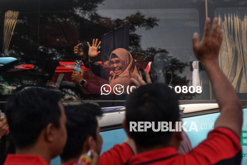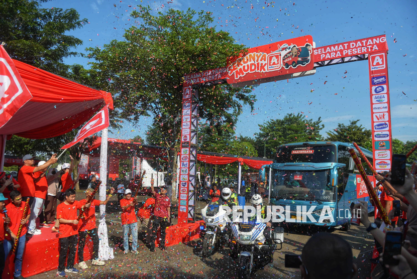 Pelepasan peserta mudik program Serunya Mudik Bersama Member Alfamidi 2026 di Jakarta, Selasa (16/3/2026). Sejalan dengan kampanye #TemanAdemRamadan, AQUA berpartisipasi dalam program Serunya Mudik Bersama Member Alfamidi 2026 yang memfasilitasi keberangkatan bagi 1.250 peserta menuju berbagai kota tujuan di Indonesia. Melalui kolaborasi ini, AQUA tidak hanya mendukung Alfamidi dalam memberangkatkan para pemudik, tetapi juga memastikan peserta tetap mendapatkan hidrasi berkualitas selama perjalanan. (FOTO : Republika/Prayogi)