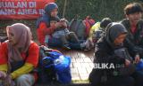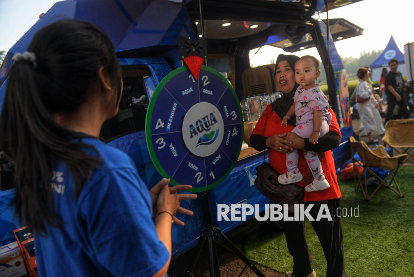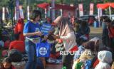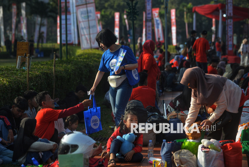 Peserta mudik membeli Aqua ketika menunggu keberangkatan bus saat mengikuti program Serunya Mudik Bersama Member Alfamidi 2026 di Jakarta, Selasa (16/3/2026). Sejalan dengan kampanye #TemanAdemRamadan, AQUA berpartisipasi dalam program Serunya Mudik Bersama Member Alfamidi 2026 yang memfasilitasi keberangkatan bagi 1.250 peserta menuju berbagai kota tujuan di Indonesia. Melalui kolaborasi ini, AQUA tidak hanya mendukung Alfamidi dalam memberangkatkan para pemudik, tetapi juga memastikan peserta tetap mendapatkan hidrasi berkualitas selama perjalanan. (FOTO : Republika/Prayogi)