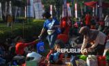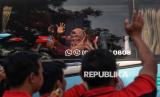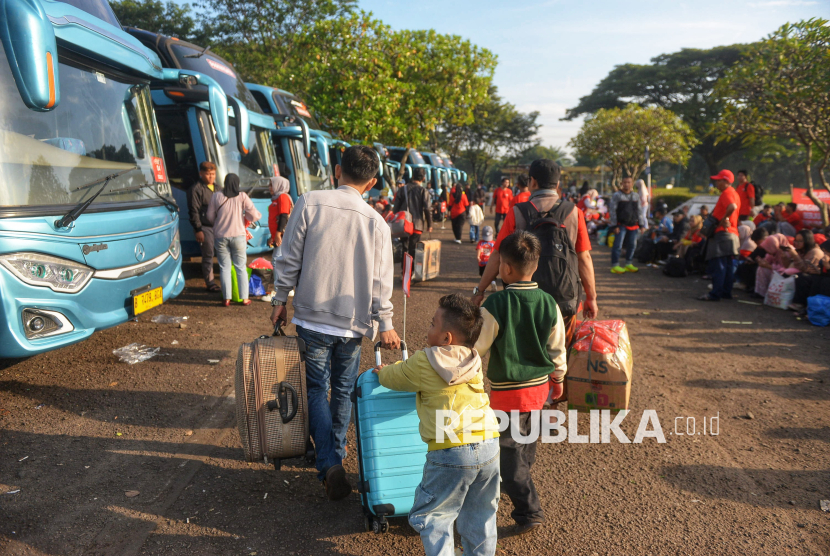 Peserta mudik berjalan menuju bus saat mengikuti program Serunya Mudik Bersama Member Alfamidi 2026 di Jakarta, Selasa (16/3/2026). Sejalan dengan kampanye #TemanAdemRamadan, AQUA berpartisipasi dalam program Serunya Mudik Bersama Member Alfamidi 2026 yang memfasilitasi keberangkatan bagi 1.250 peserta menuju berbagai kota tujuan di Indonesia. Melalui kolaborasi ini, AQUA tidak hanya mendukung Alfamidi dalam memberangkatkan para pemudik, tetapi juga memastikan peserta tetap mendapatkan hidrasi berkualitas selama perjalanan. (FOTO : Republika/Prayogi)