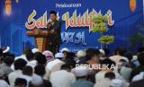 Dewan Pakar Majelis Tarjih dan Tajdid PWM DKI Jakarta Izza Rohman menyampaikan khotbah Idul Fitri 1447 H di pelataran Gedung Pimpinan Pusat (PP) Muhammadiyah, Menteng, Jakarta Pusat, Jumat (20/3/2026). Warga Muhammadiyah melaksanakan Sholat Idul Fitri pada hari Jumat (20/3) atau satu hari lebih awal dari ketetapan Pemerintah yang jatuh pada Sabtu (21/3). (FOTO : Edwin Putranto/Republika)