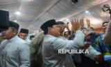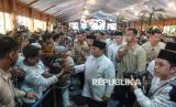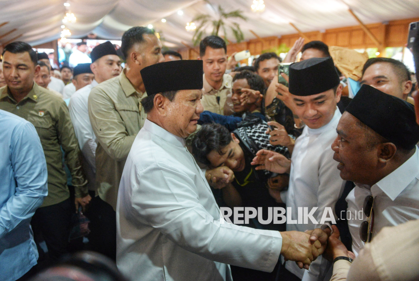 Presiden Prabowo Subianto menyapa masyarakat yang hadir dalam acara Gelar Griya atau open house di Istana Kepresidenan, Jakarta, Sabtu (21/3/2026). Dalam acara tersebut Presiden Prabowo didampingi putranya, Didit Hediprasetyo. Warga tampak antusias untuk bersalaman hingga berswafoto. Kegiatan ini menjadi momen silaturahmi yang dinantikan banyak pihak sekaligus kesempatan bagi masyarakat untuk bertemu langsung dengan kepala negara dalam suasana hangat dan terbuka. (FOTO : Republika/Prayogi)