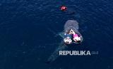 REPUBLIKA.CO.ID, GORONTALO -- Pengunjung menaiki perahu transparan untuk berfoto bersama hiu paus (Rhincodon Typus) di Pantai Botubarani, Kabupaten Bone Bolango, Gorontalo, Senin (23/3/2026).