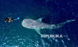 Pemandu wisata berenang bersama hiu paus (Rhincodon Typus) di Pantai Botubarani, Kabupaten Bone Bolango, Gorontalo, Senin (23/3/2026). Kelompok sadar wisata (Pokdarwis) setempat mencatat lonjakan pengunjung di objek wisata hiu paus sejak H-3 Lebaran dengan rata-rata 700 orang/hari yang didominasi wisatawan dari Sulawesi Utara. (FOTO : ANTARA FOTO/Adiwinata Solihin)