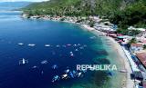 Foto udara pengunjung menaiki perahu wisata untuk melihat hiu paus (Rhincodon Typus) di Pantai Botubarani, Kabupaten Bone Bolango, Gorontalo, Senin (23/3/2026). Kelompok sadar wisata (Pokdarwis) setempat mencatat lonjakan pengunjung di objek wisata hiu paus sejak H-3 Lebaran dengan rata-rata 700 orang/hari yang didominasi wisatawan dari Sulawesi Utara. (FOTO : ANTARA FOTO/Adiwinata Solihin)