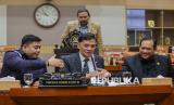 Ketua Komisi III DPR Habiburokhman (tengah) bersama Anggota Komisi III Rikwanto (kanan) dan Anggota Komisi VI Kawendra Lukistian (kiri) mengikuti Rapat Dengar Pendapat Umum (RDPU) terkait kasus videografer Amsal Christy Sitepu yang dituduh melakukan korupsi anggaran proyek video profil desa di Kompleks Parlemen, Senayan, Jakarta, Senin (30/3/2026). Komisi III DPR menyatakan secara substantif kerja kreatif videografer tidak memiliki harga tertentu sehingga tidak bisa dikatakan terjadi penggelembungan atau mark up dari harga baku serta menyerukan agar Majelis Hakim mempertimbangkan putusan bebas atau setidaknya ringan berdasarkan fakta persidangan. (FOTO : Republika/Thoudy Badai)