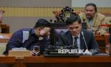 Ketua Komisi III DPR Habiburokhman (kanan) bersama Anggota Komisi VI Kawendra Lukistian (kiri) mengikuti Rapat Dengar Pendapat Umum (RDPU) terkait kasus videografer Amsal Christy Sitepu yang dituduh melakukan korupsi anggaran proyek video profil desa di Kompleks Parlemen, Senayan, Jakarta, Senin (30/3/2026). Komisi III DPR menyatakan secara substantif kerja kreatif videografer tidak memiliki harga tertentu sehingga tidak bisa dikatakan terjadi penggelembungan atau mark up dari harga baku serta menyerukan agar Majelis Hakim mempertimbangkan putusan bebas atau setidaknya ringan berdasarkan fakta persidangan. (FOTO : Republika/Thoudy Badai)