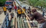 Personel kepolisian membantu mengangkut bambu sebagai salah satu material untuk menutup tanggul Sungai Tuntang yang jebol pascabanjir bandang di Dukuh Solondoko, Desa Trimulyo, Kecamatan Guntur, Demak, Jawa Tengah, Senin (6/4/2026). Pada hari keempat peristiwa banjir bandang tersebut ratusan personel dari TNI-Polri, BPBD Demak, BBWS Pemali Juana, pemadam kebakaran beserta sukarelawan membantu warga membersihkan material tanah yang menutup akses jalan serta saluran irigasi guna mempercepat pemulihan infrastruktur untuk dapat dimanfaatkan kembali oleh warga. (FOTO : ANTARA FOTO/Aji Styawan)