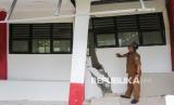 Guru melihat kondisi ruang kelas yang rusak akibat pergerakan tanah di SD Negeri Kutakarang 03, Cibitung, Pandeglang, Banten, Senin (6/4/2026). Sebanyak dua ruang kelas mengalami kerusakan parah akibat pergerakan tanah yang terjadi di sekolah itu dan proses belajar mengajar untuk murid kelas tiga dan empat harus dipindahkan ke ruangan lain yang tersedia. (FOTO : ANTARA FOTO/Angga Budhiyanto)