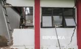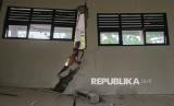 REPUBLIKA.CO.ID, BANTEN -- Pekerja menyelesaikan proses pemisahan ruang kelas yang rusak akibat pergerakan tanah di SD Negeri Kutakarang 03, Cibitung, Pandeglang, Banten, Senin (6/4/2026).