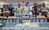 Kepala Badan Pengawas Obat dan Makanan (BPOM) Taruna Ikrar (ketiga kanan) bersama jajaran pejabat terkait menunjukan barang bukti saat konferensi pers terkait penindakan pengedaran produk gas medis dinitrogen monoksida (N20) atau gas tertawa di Kantor BPOM, Jakarta, Kamis (9/4/2026). Badan Pengawas Obat dan Makanan (BPOM) mengamankan puluhan gas tertawa atau gas dinitrogen monoksida (N20) yang dijual secara ilegal di marketplace dari rumah di kawasan Cengkareng, Jakarta Barat. Sebagai tindak lanjut, perkara tersebut sedang diproses secara hukum atas dugaan pelanggaran produksi dan pengedaran sediaan farmasi dan alat kesehatan yang tidak memenuhi ketentuan dan mutu. Hal tersebut dilakukan mengingat, gas tersebut dapat berbahaya jika disalahgunakan dan tidak sesuai anjuran medis. (FOTO : Republika/Thoudy Badai)
