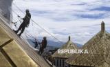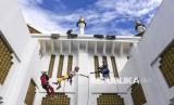 Sejumlah relawan yang tergabung dalam Tasikmalaya Caving Community (TCC) membersihkan kubah masjid dengan teknik vertikal dalam aksi Clean Up Masjid Agung di Kota Tasikmalaya, Jawa Barat, Ahad (12/4/2026). Kegiatan kolaborasi antara organisasi pecinta alam se-Kota Tasikmalaya dengan pegiat olahraga outdoor se-Priangan Timur dan pekerja ketinggian tersebut bertujuan mengkampanyekan keselamatan kerja di ketinggian sekaligus meningkatkan kesadaran masyarakat akan pentingnya menjaga kebersihan lingkungan, khususnya di area tempat ibadah. (FOTO : ANTARA FOTO/Adeng Bustomi)
