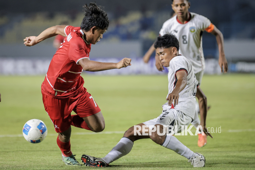 REPUBLIKA.CO.ID, GRESIK -- Timnas Indonesia berhadapan dengan Timor Leste pada pertandingan penyisihan grup A ASEAN U-17 Boys Championship atau AFF U-17 di Stadion Gelora Joko Samudro, Gresik, Jawa Timur, Senin (13/4/2026).