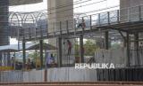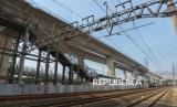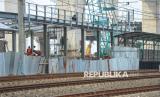 Pekerja menyelesaikan pembangunan Stasiun Jakarta International Stadium (JIS), Jakarta, Rabu (15/4/2026). Stasiun JIS ditargetkan mulai beroperasi melayani penumpang KRL pada Juni 2026 dengan rute Tanjung Priok–Jakarta Kota. Diharapkan, stasiun ini dapat mendukung mobilitas masyarakat menuju kawasan olahraga dan permukiman di sekitarnya. Pembangunan Stasiun JIS saat ini telah memasuki tahap akhir dan diharapkan selesai tepat waktu sehingga stasiun siap diuji coba sebelum resmi beroperasi. (FOTO : Republika/Prayogi)