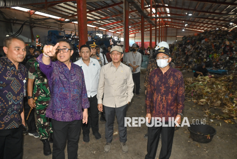 Menteri Lingkungan Hidup Hanif Faisol Nurofiq (tengah) bersama Gubernur Bali Wayan Koster (kanan) dan Wali Kota Denpasar I Gusti Ngurah Jaya Negara (kedua kiri) meninjau proses pengelolaan sampah di Tempat Pengolahan Sampah Terpadu (TPST) Tahura, Denpasar, Bali, Jumat (17/4/2026). Peninjauan itu untuk memastikan penanganan sampah di sejumlah TPST dan TPS 3R di wilayah Denpasar berjalan dengan optimal. (FOTO : ANTARA FOTO/Fikri Yusuf)