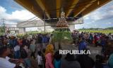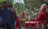 REPUBLIKA.CO.ID, SLEMAN -- Warga berebut gunungan hasil pertanian saat kirab budaya di Desa Margokaton, Seyegan, Sleman, D.I Yogyakarta, Ahad (19/4/2026).