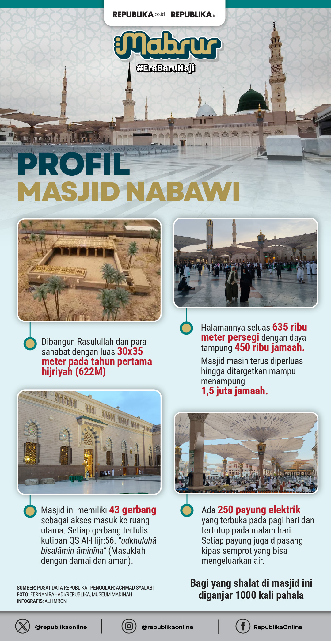 Masjid ini punya banyak titik untuk disambangi. Raudhah dan makam Rasulullah dua diantaranya. Di masjid tersebut juga ada payung elektrik yang bisa buka tutup secara otomatis untuk melindungi jamaah dari teriknya cuaca. Kepada jamaah, mari mengenal Masjid Nabawi.