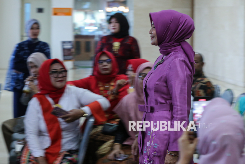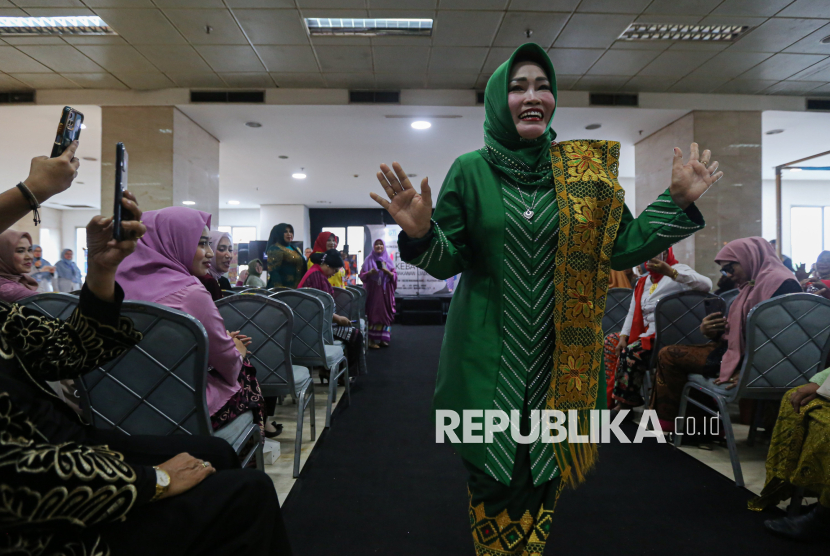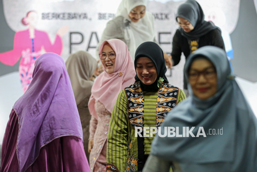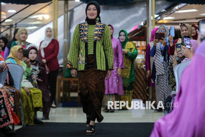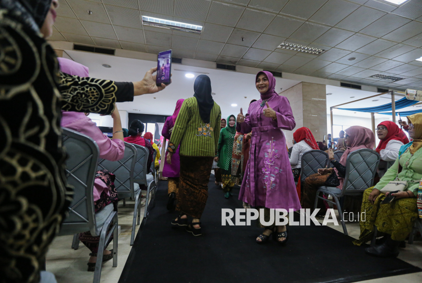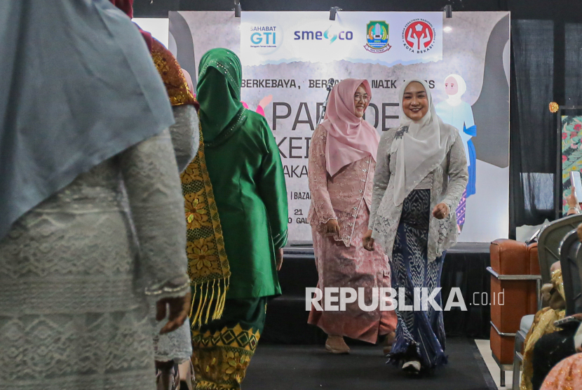 Peserta mengikuti kegiatan peragaan busana kebaya dalam acara bertajuk Budaya Naik Panggung, UMKM Naik Kelas yang diselenggarakan di Galery Nusantara gedung Smesco, Jakarta, Selasa (21/4/2026). Kegiatan yang diselenggarakan oleh Sahabat Genggam Teman Indonesia bersama Pemerintah Kota Bekasi tersebut dalam rangka melestarikan warisan budaya takbenda dengan mengenakan pakaian kebaya bertepatan pada momentum Hari Kartini yang diperingati setiap 21 April. (FOTO : Republika/Thoudy Badai)