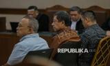 Terdakwa Direktur Utama PT Pertamina Patra Niaga (PPN) periode 2021-2023 Alfian Nasution, Direktur Pemasaran dan Niaga Pertamina periode 2012-2014 Hanung Budya Yuktyanta, serta Business Development Manager Trafigura Pte Ltd periode 2019-2021 Martin Haendra Nata (kiri-kanan) mengikuti sidang tuntutan di Pengadilan Tipikor Jakarta, Kamis (23/4/2026). Jaksa penuntut umum (JPU) menuntut Alfian Nasution dengan hukuman 14 tahun penjara dan uang pengganti Rp 5 miliar subsider 7 tahun penjara, sementara Hanung dituntut 8 tahun penjara serta uang pengganti Rp 4 miliar subsider 4 tahun penjara dan Martin Haendra Nata dituntut 13 tahun penjara Rp 5 miliar subsider 7 tahun penjara. Ketiga terdakwa tersebut juga dituntut membayar pidana sebesar Rp 1 miliar, karena jaksa menilai Alfian bersama dua terdakwa lainnya terbukti bersalah melakukan tindak pidana korupsi tata kelola minyak mentah dan produk kilang pada tahun 2018-2023. (FOTO : Republika/Thoudy Badai)