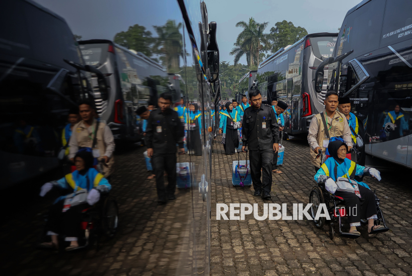 Petugas membantu seorang calon haji lansia kloter tiga embarkasi Jakarta Pondok Gede (JKG) memasuki bus saat pelepasan di halaman Pemkab Bogor, Cibinong, Kabupaten Bogor, Jawa Barat, Kamis (23/4/2026). Sebanyak 445 calon haji Kabupaten Bogor kloter tiga diberangkatkan menuju embarkasi JKG selanjutnya diterbangkan menuju tanah suci. (FOTO : ANTARA FOTO/Yulius Satria Wijaya)