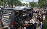 REPUBLIKA.CO.ID, CIBINONG -- Keluarga dan kerabat melambaikan tangan saat pelepasan calon haji kloter tiga embarkasi Jakarta Pondok Gede (JKG) di halaman Pemkab Bogor, Cibinong, Kabupaten Bogor, Jawa Barat, Kamis (23/4/2026).