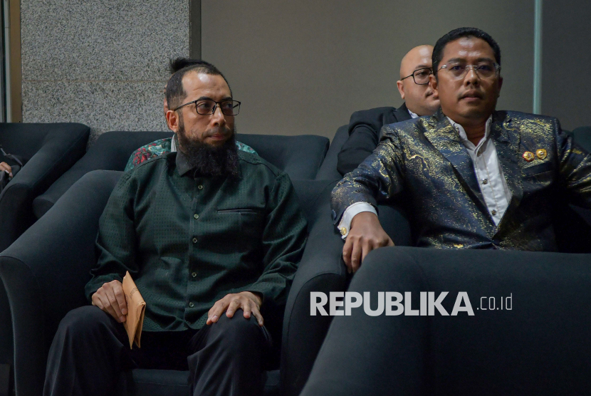 Pendakwah sekaligus pemilik biro perjalanan haji PT Zahra Oto Mandiri atau Uhud Tour Khalid Zeed Abdullah Basalamah (kiri) duduk saat tiba untuk menjalani pemeriksaan di Gedung Merah Putih KPK, Jakarta, Kamis (23/4/2026). KPK melakukan pemeriksaan kepada Khalid Basalamah sebagai saksi terkait kasus dugaan korupsi kuota haji 2023-2024. (FOTO : ANTARA FOTO/Reno Esnir)