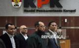 Ketua Asosiasi Mutiara Haji Khalid Zeed Abdullah Basalamah (kedua kanan) bersiap menjalani pemeriksaan di Gedung Merah Putih KPK, Jakarta, Kamis (23/4/2026). Khalid Basalamah diperiksa sebagai saksi terkait kasus dugaan korupsi kuota haji 2023-2024. (FOTO : ANTARA FOTO/Reno Esnir)