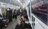 Penumpang menaiki transportasi umum Moda Raya Terpadu (MRT) di kawasan Blok M, Jakarta, Jumat (24/4/2026). Pemerintah Provinsi DKI Jakarta memberlakukan tarif khusus Rp1 bagi masyarakat yang menggunakan transportasi umum dalam rangka memperingati Hari Transportasi Nasional pada Jumat, 24 April 2026. Layanan ini berlaku untuk TransJakarta, MRT Jakarta, dan LRT Jakarta, mulai pukul 00.00-23.59 WIB. (FOTO : Republika/Thoudy Badai)