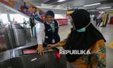 Penumpang menempelkan kartu uang elektronik usai menaiki transportasi umum Moda Raya Terpadu (MRT) di kawasan Blok M, Jakarta, Jumat (24/4/2026). Pemerintah Provinsi DKI Jakarta memberlakukan tarif khusus Rp1 bagi masyarakat yang menggunakan transportasi umum dalam rangka memperingati Hari Transportasi Nasional pada Jumat, 24 April 2026. Layanan ini berlaku untuk TransJakarta, MRT Jakarta, dan LRT Jakarta, mulai pukul 00.00-23.59 WIB. (FOTO : Republika/Thoudy Badai)