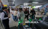 REPUBLIKA.CO.ID, JAKARTA -- Penumpang menempelkan kartu uang elektronik usai menaiki transportasi umum Moda Raya Terpadu (MRT) di kawasan Blok M, Jakarta, Jumat (24/4/2026).
