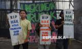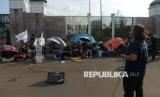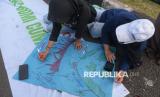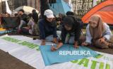 Sejumlah orang menuliskan kata-kata saat mengikuti aksi damai memperingati Hari Bumi di depan Kompleks Parlemen, Jakarta, Jumat (24/4/2026). Aksi tersebut digelar dalam rangka memperingati Hari Bumi yang tahun ini memasuki peringatan ke-56. Kondisi bumi dinilai semakin memprihatinkan dan berada di ambang krisis bagi kehidupan makhluk hidup. Ancaman kenaikan suhu bumi sebesar 1,5 derajat Celsius pun dinilai belum mampu diatasi secara signifikan. (FOTO : Republika/Prayogi)